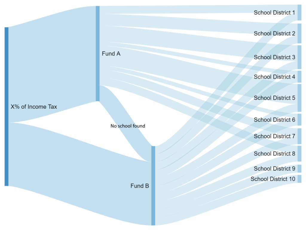 An explicit percentage of collected income tax (percentage X) will be allocated to school funding. From this revenue, we will create two funds, Fund A and Fund B. Some of the revenue will go into Fund A (percentage Y) and the remainder into Fund B.